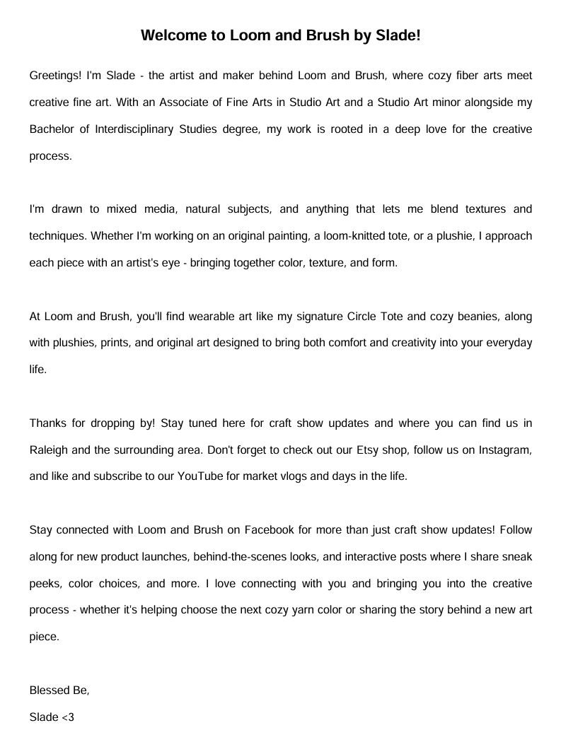 Contact Me loomandbrushnc@gmail.com Feel free to contact me with any inquiries or questions! Name Email Address Message Submit